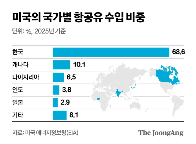 EIA에 따르면 미국은 지난해 항공유의 약 70%를 한국에서 수입해 썼다. 캘리포니아·