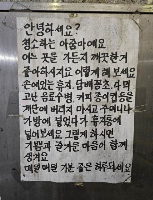 한 건물 미화원이 쓰레기 무단 투기를 경고하며 쓴 대자보가