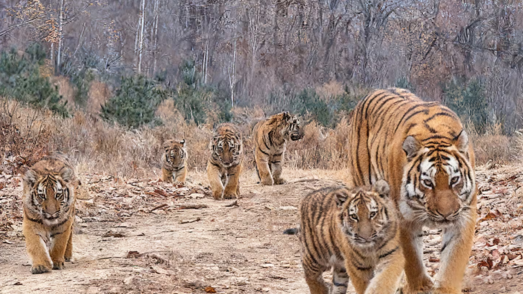 야생 백두산 호랑이 어미가 새끼 5마리와 함께 있는 장면이 포착됐다.